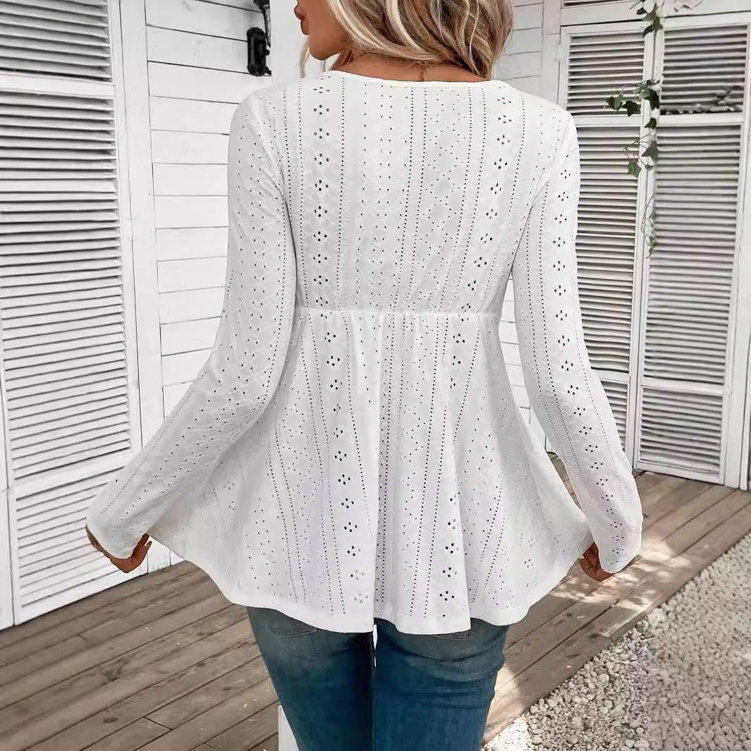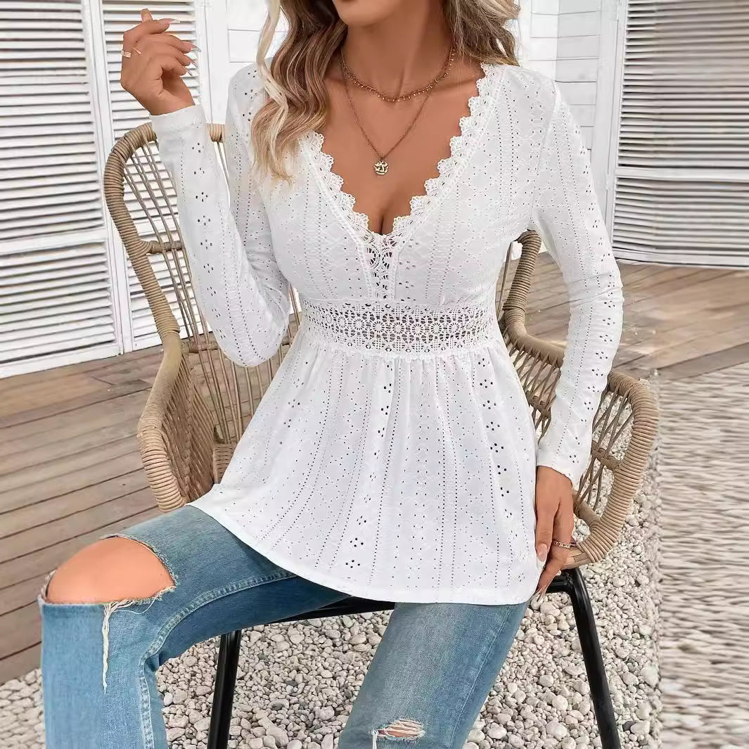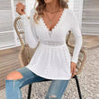 Elegant Ladies' Solid-Colour V-Neck Blouse with Lace-Trimmed Sleeves