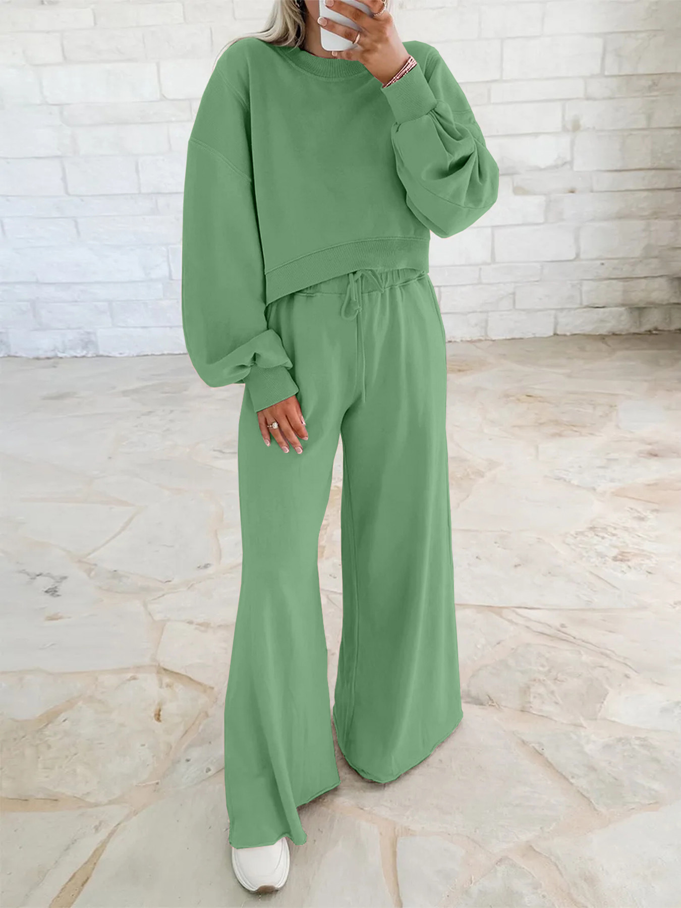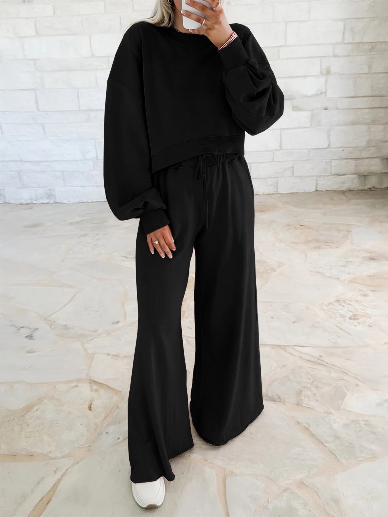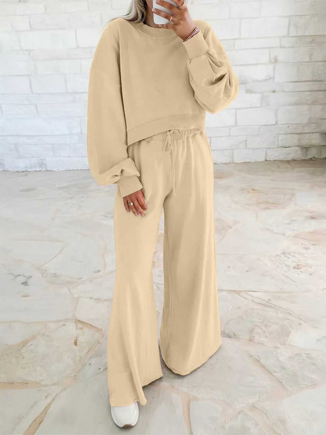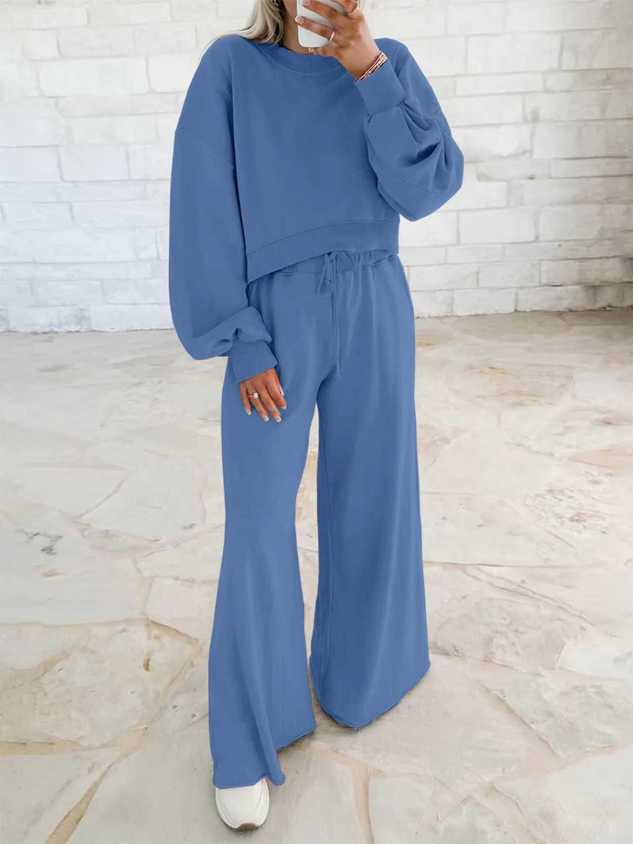 Off-the-shoulder puff-sleeve cropped jumper paired with drawstring wide-leg trousers Women's ensemble