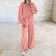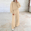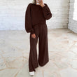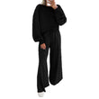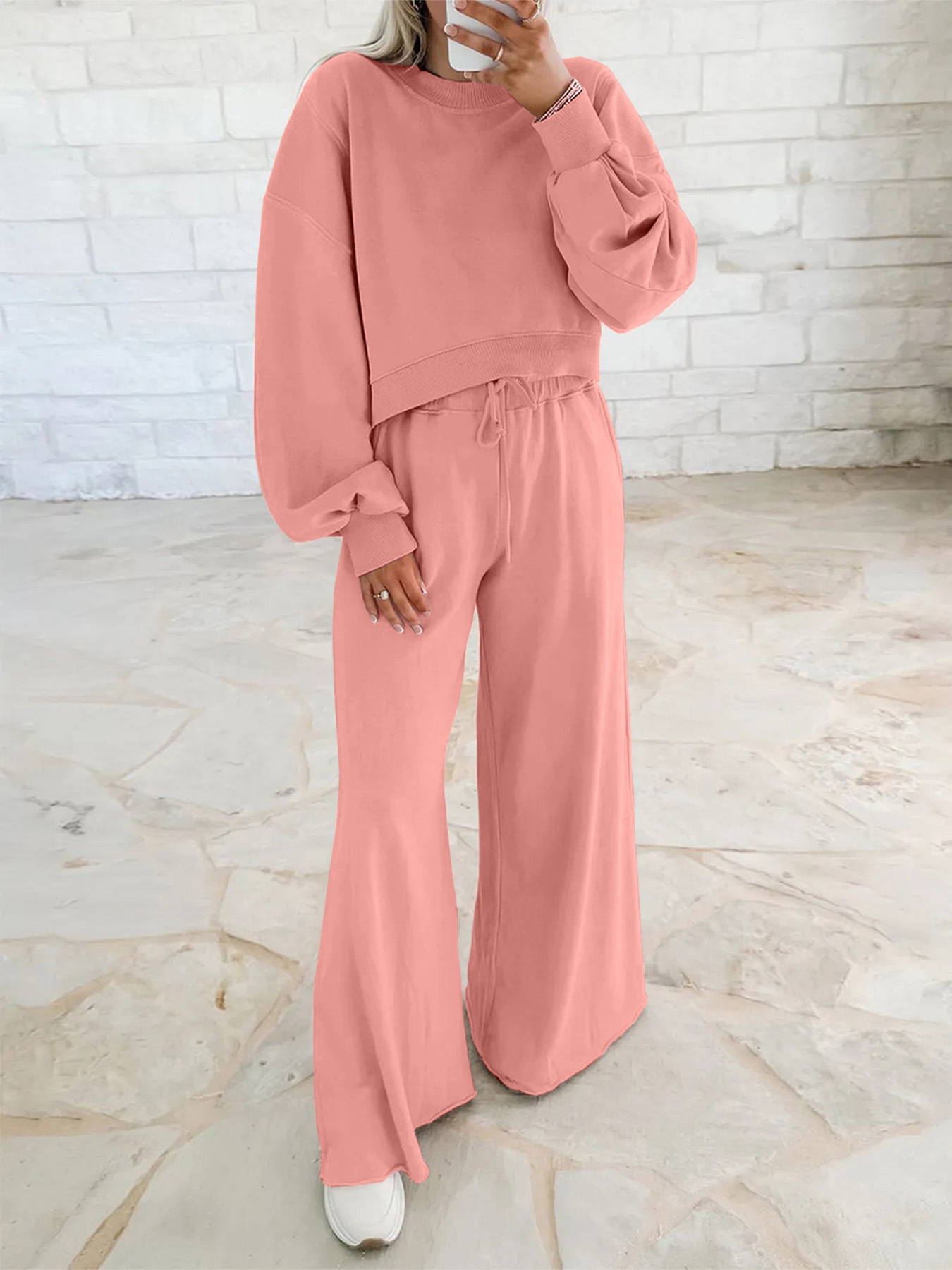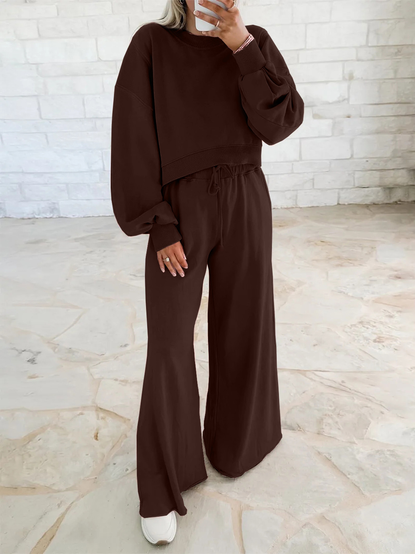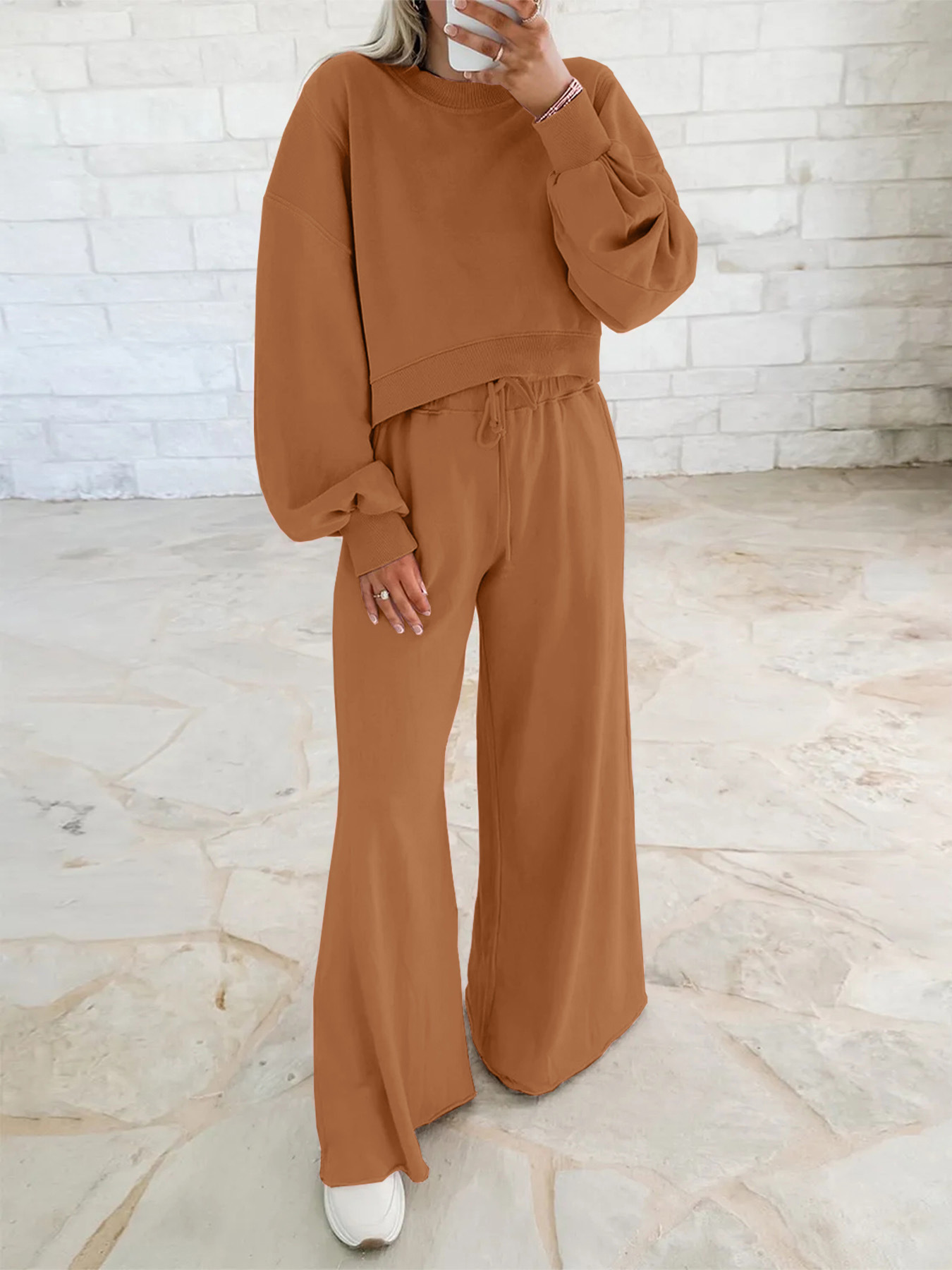 Off-the-shoulder puff-sleeve cropped jumper paired with drawstring wide-leg trousers Women's ensemble