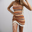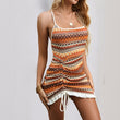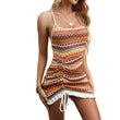Women boho Crochet Striped Swimsuit Coverup, , Drawstring Ruffle Mini Dresses