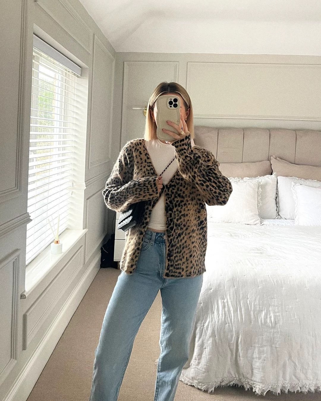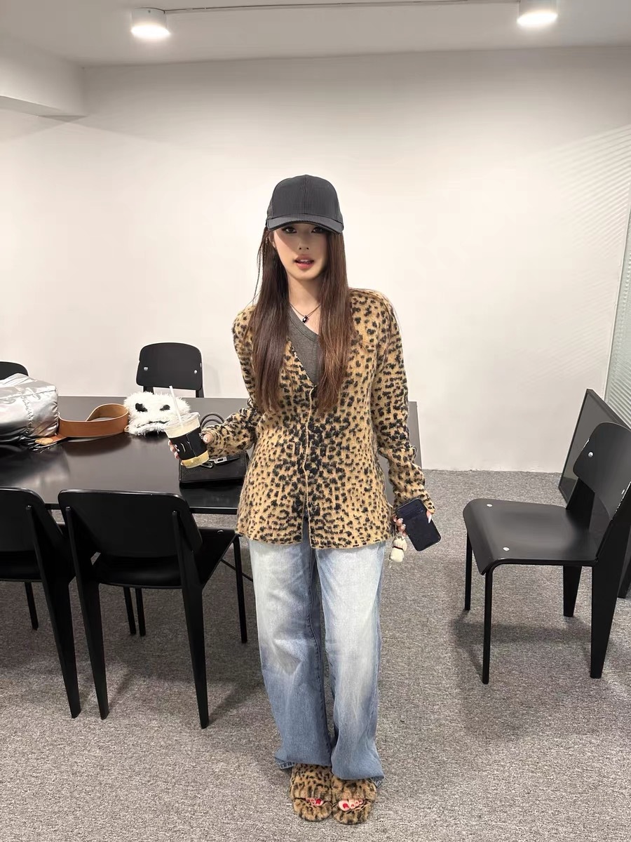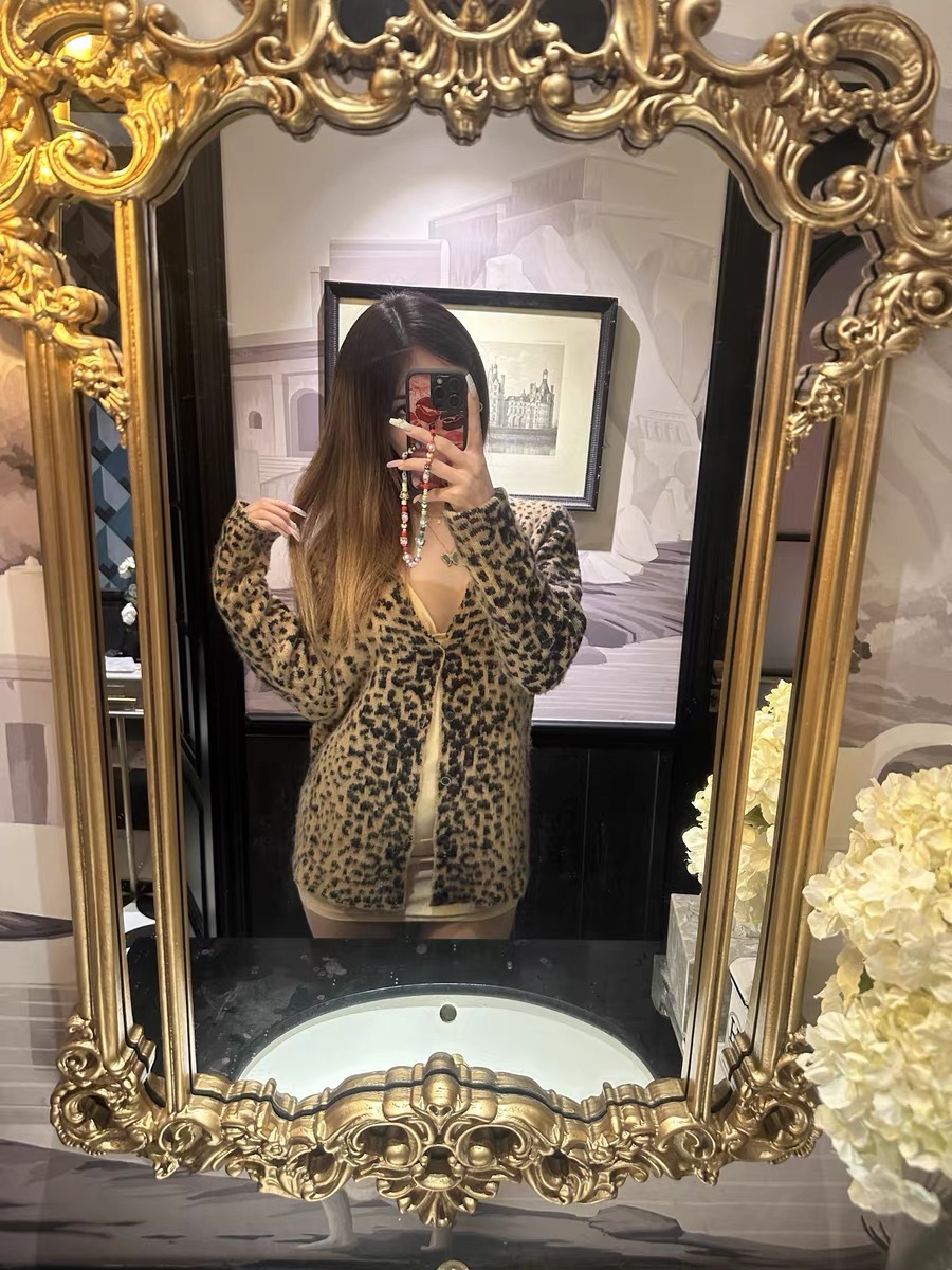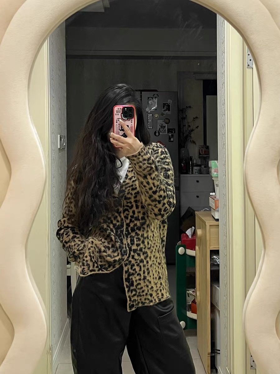 Women Leopard Print Long Sleeve V Neck Button Down Sweater Cardigan Casual Knit Lightweight Fall Winter Outwear Tops