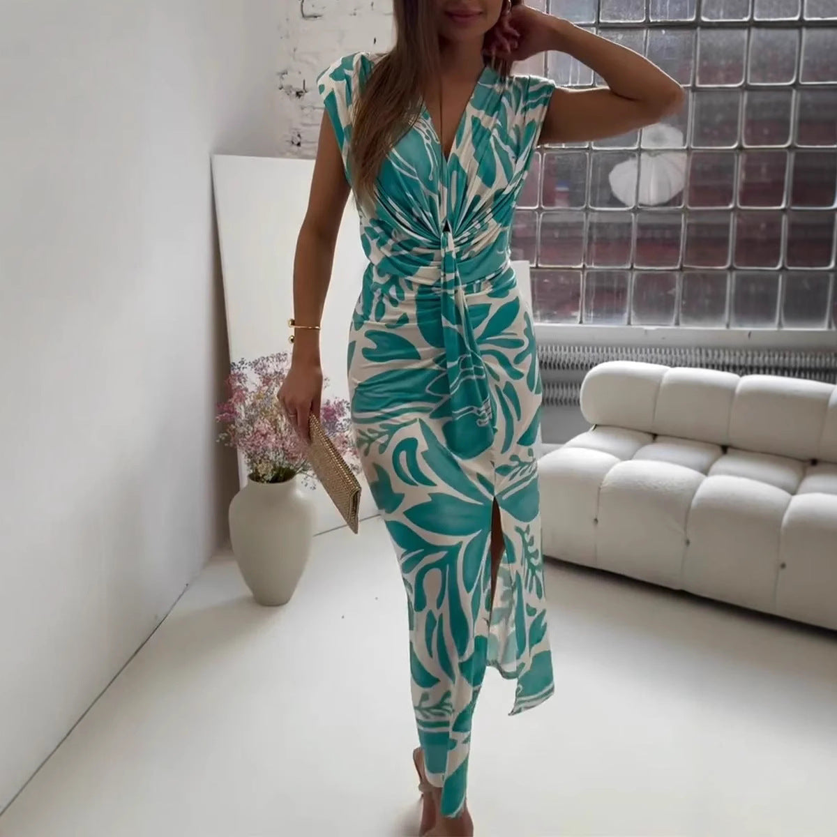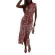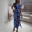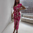 Women Short Sleeve Graphic Party Dress Tie-Up Lady Office Slit Bodycon Long Dress