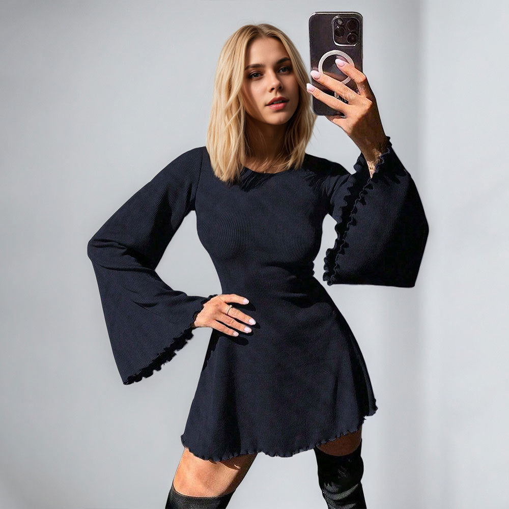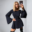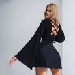 Womens Casual Long Sleeve Mini Dress Sexy Round Neck Solid Long Sleeve Hollow Tie Up A-Line Dresses Outfits Clothes
